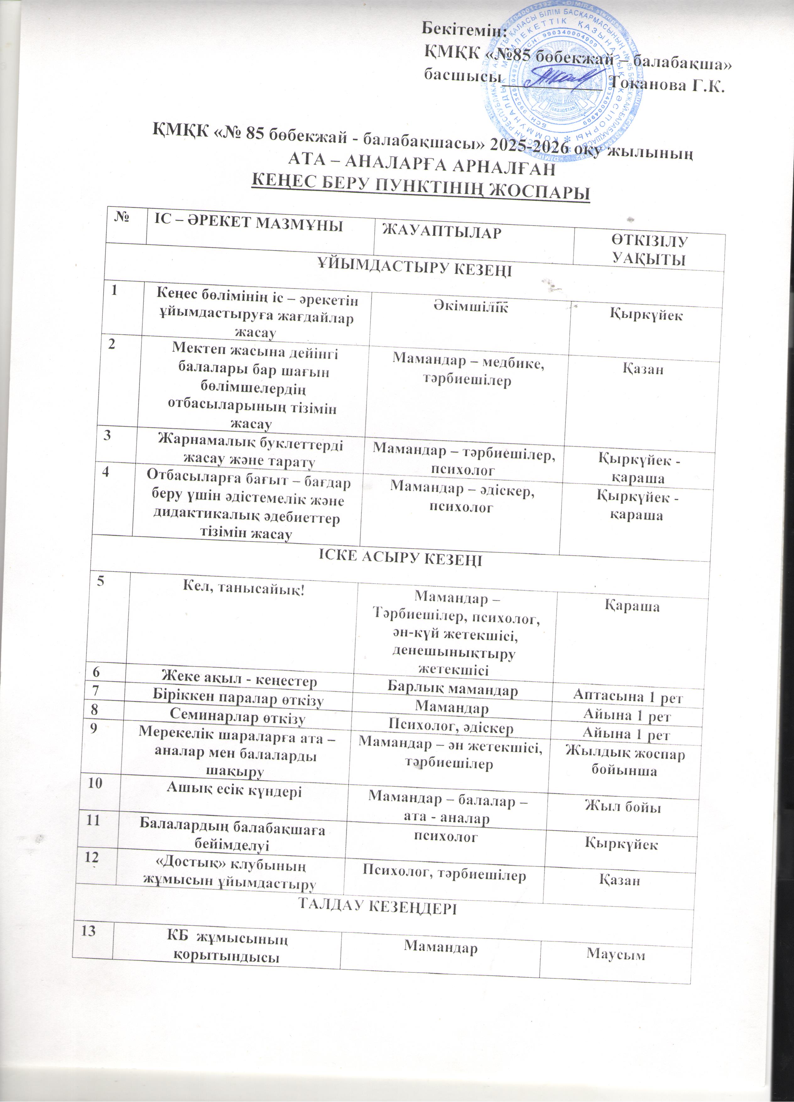02 қыркүйек 2025 0 1 2 3 4 5 КМҚК "№85 бөбекжай - балабақшасы" 2025 -2026 оқу жылыныңа ата - аналарға арналған кеңес беру пункітінің жоспары