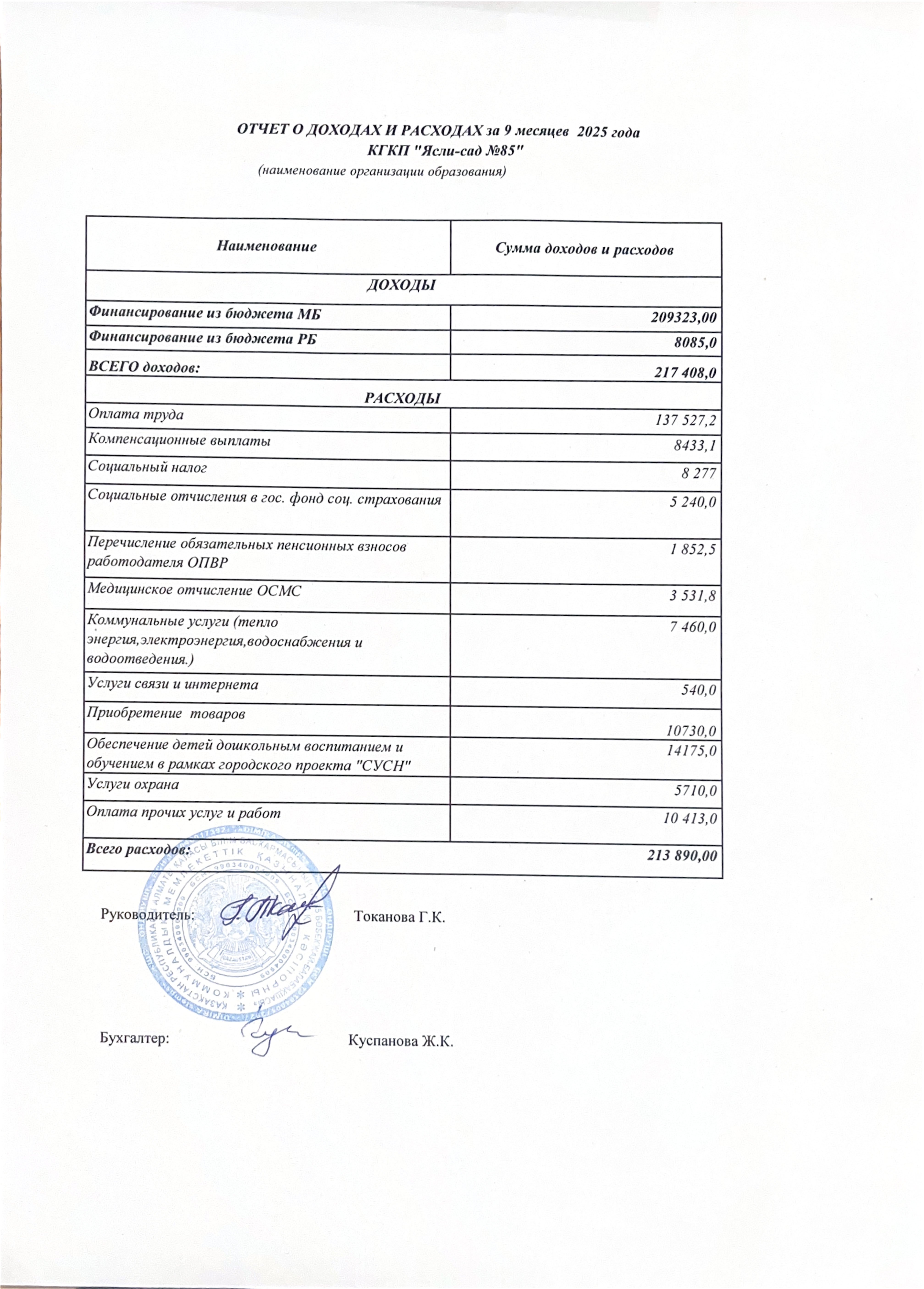 Кіріс, Шығыс есебі » КГКП "Ясли сад №85"