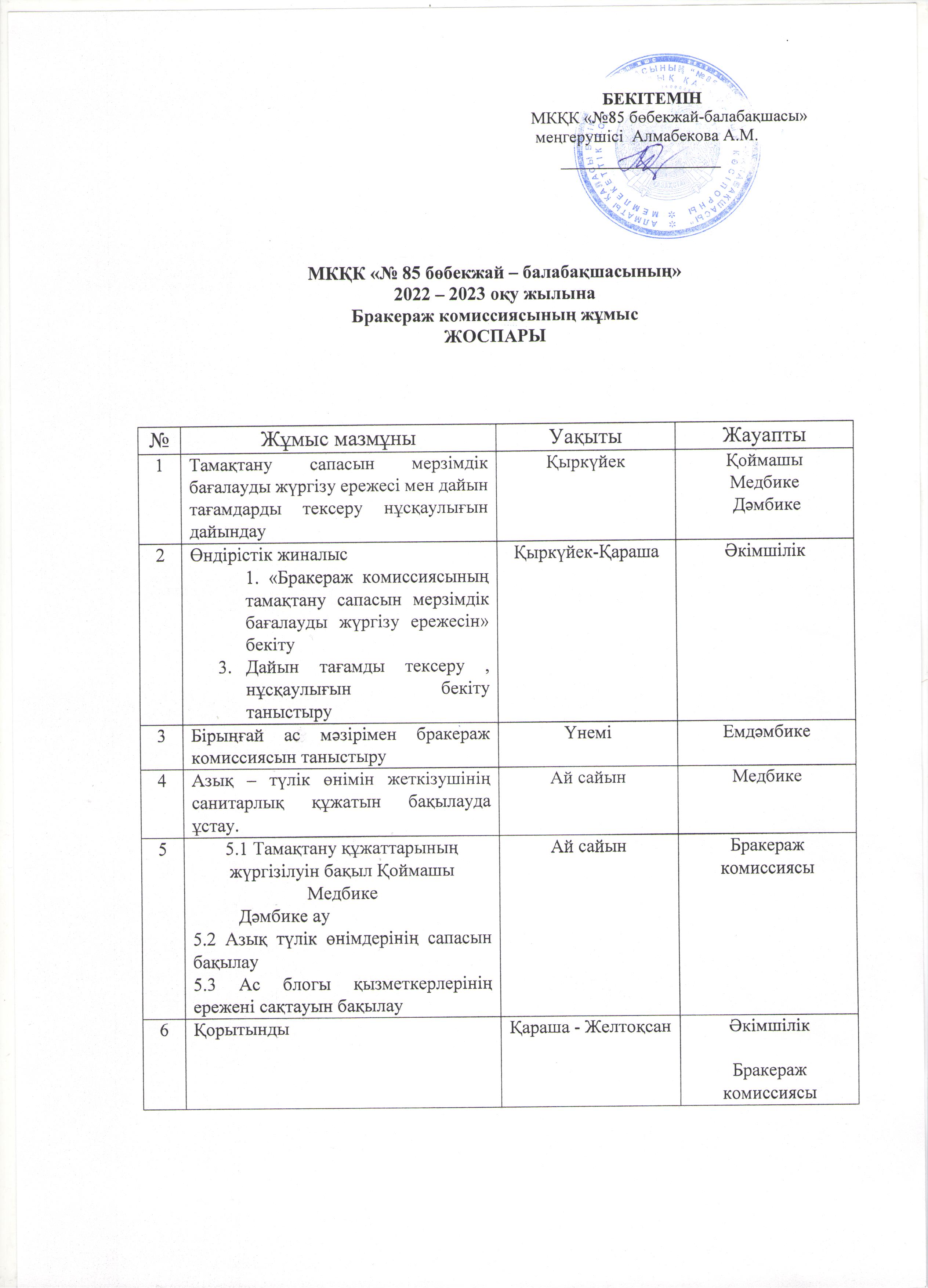 Бракераж комиссиясының жұмыс жоспары 2022-2023 оқу жылына » КГКП "Ясли сад №85"