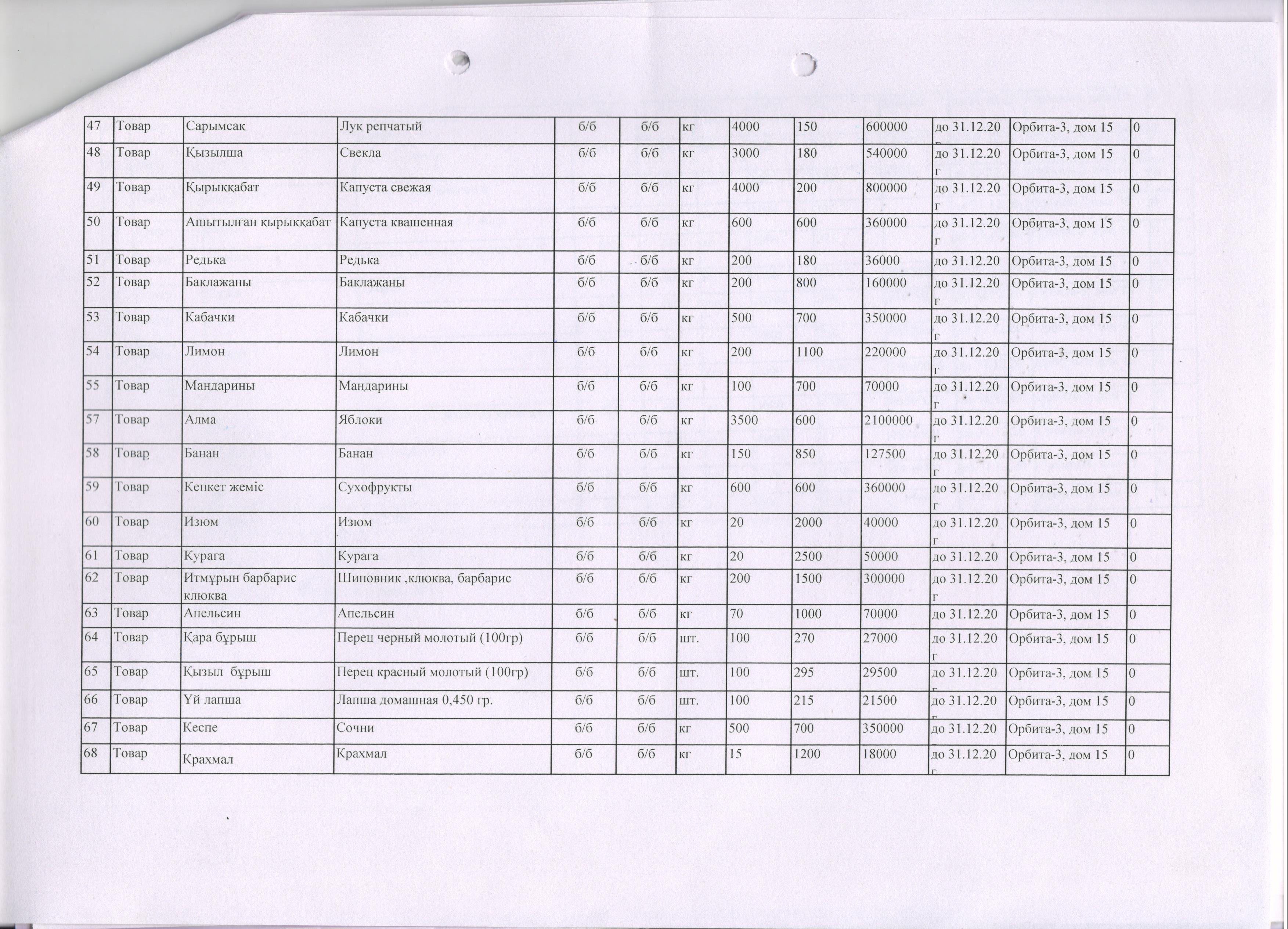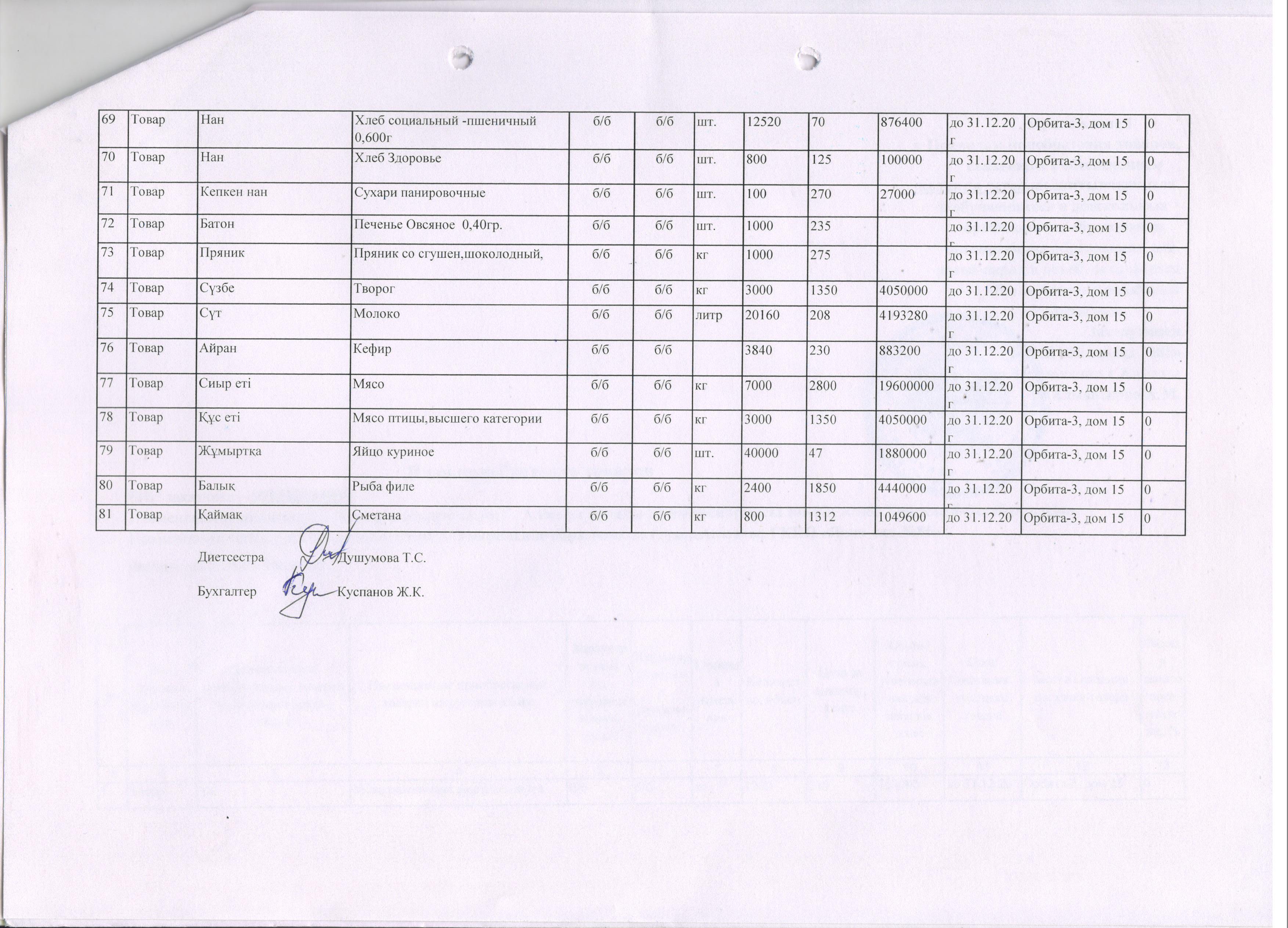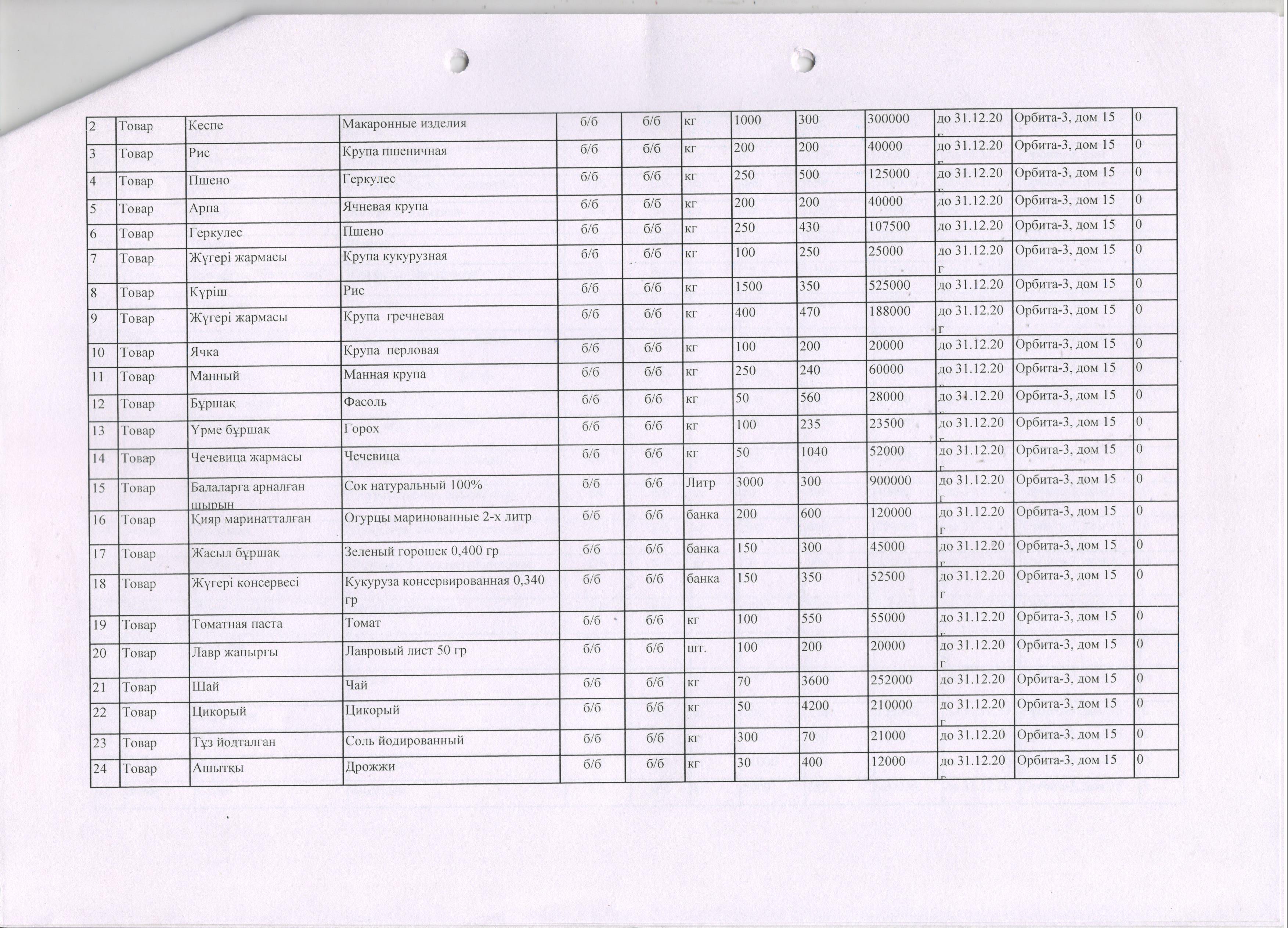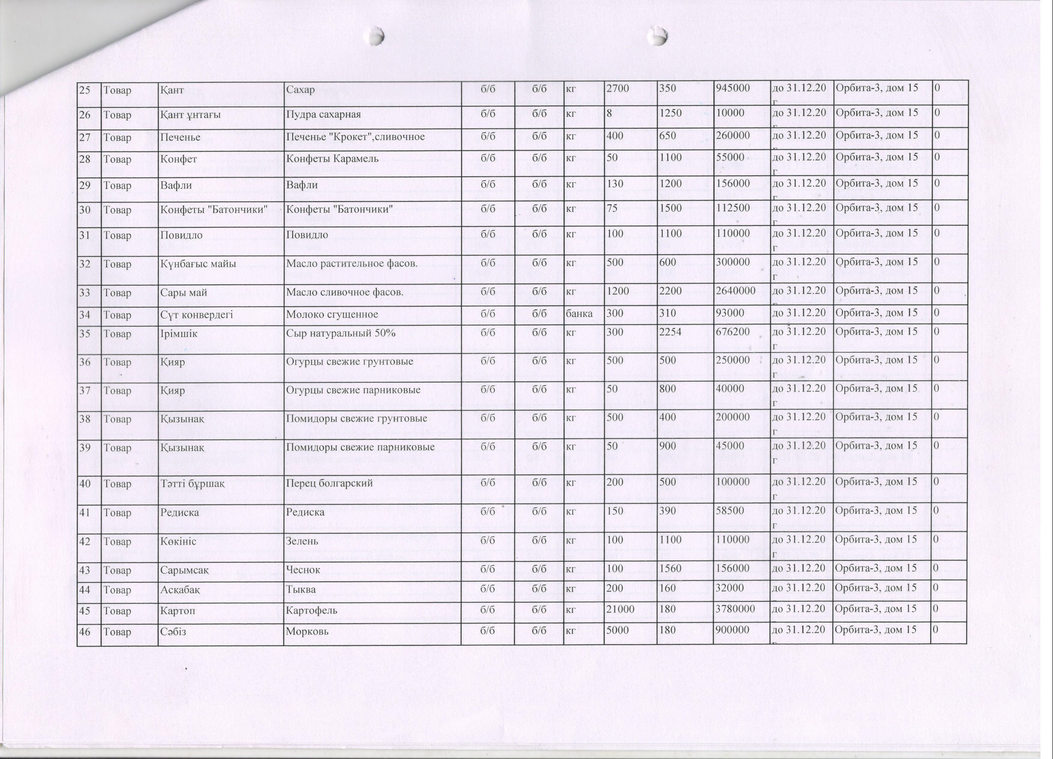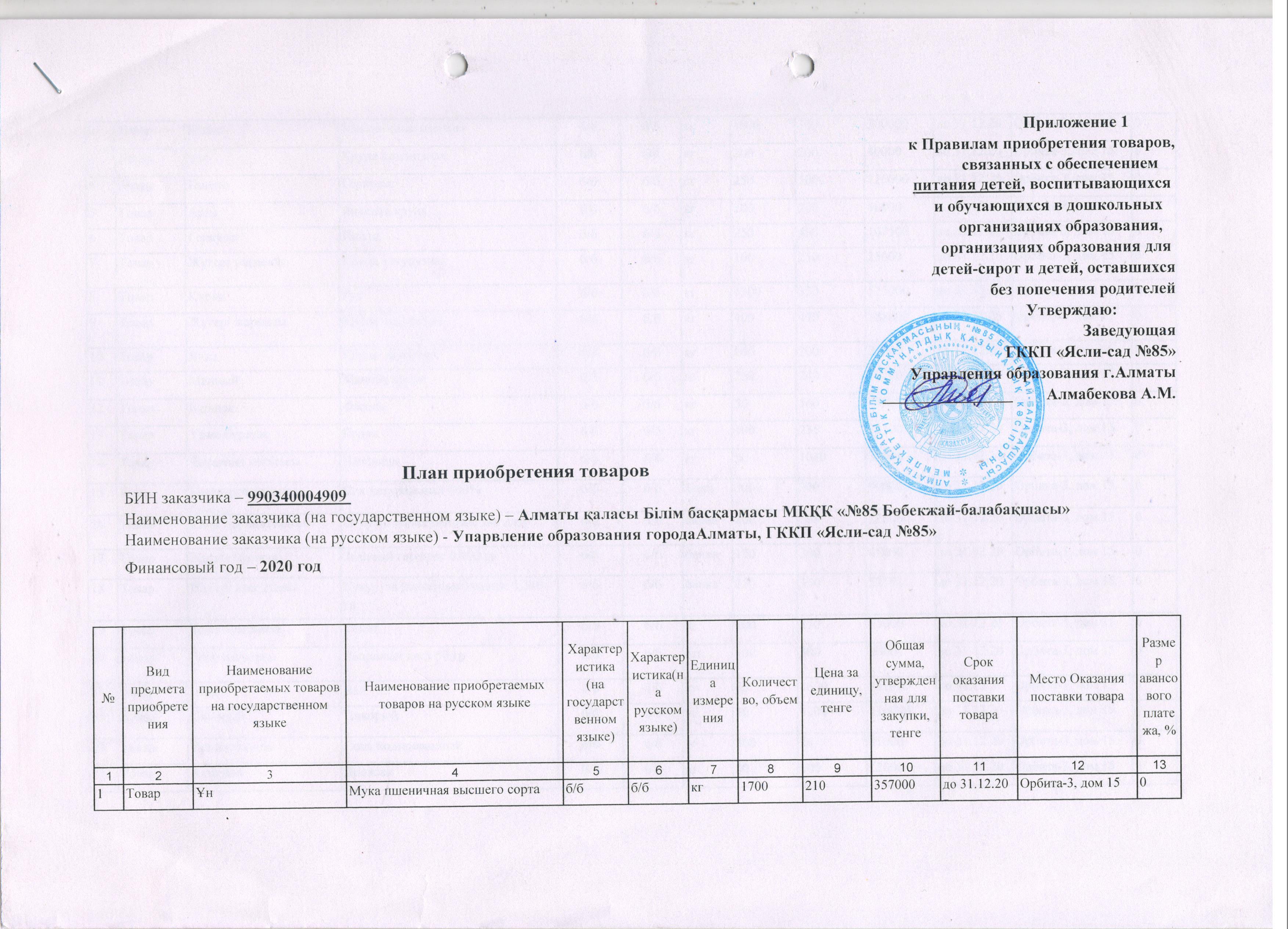 План продуктов питания на 2020 год. » КГКП "Ясли сад №85"
